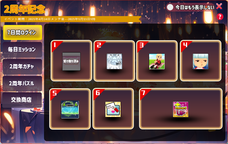 - 毎日ミッションのクリアやゲームプレイで獲得した「2周年コイン」と「2周年メダル」で様々なアイテムと交換できます。