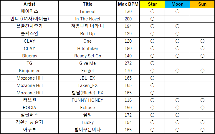 新規実装楽曲「처음부터 너와 나」「칼날(Blade)_EX」「꽃씨」「별이꾸는바다」の4曲に関しまして、ゲーム内に実装されていない問題を確認いたしました。