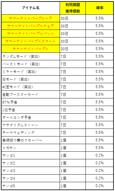 ■「ラッキーサイコロ」の使用により獲得できるアイテムと確率一覧