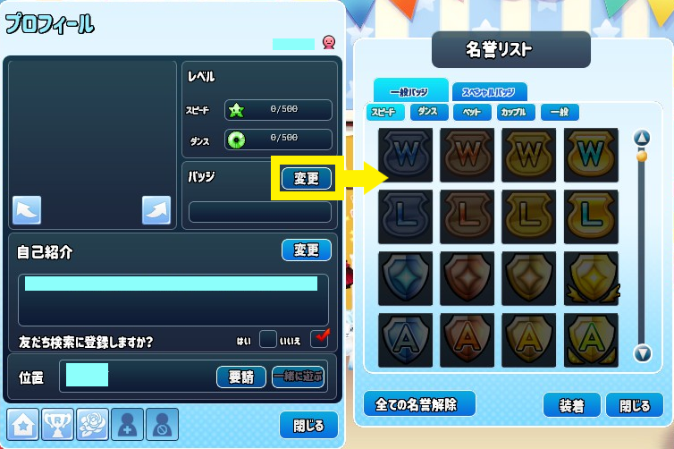 プロフィールから「バッチ」-「名誉リスト」より獲得した称号をセットできます。